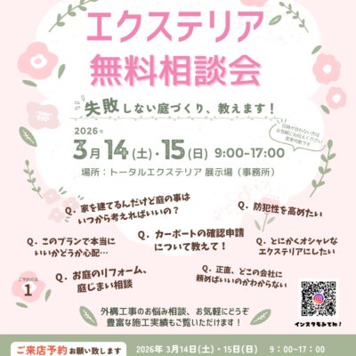 厳しい冬が終わり、びっくりする速度で雪が融け、晴れた日はぽかぽか陽気で春めいてきましたね~ 本当に安心します。 さて、お庭工事の無料相談会を開催し […]