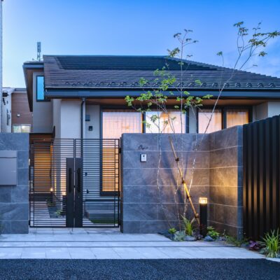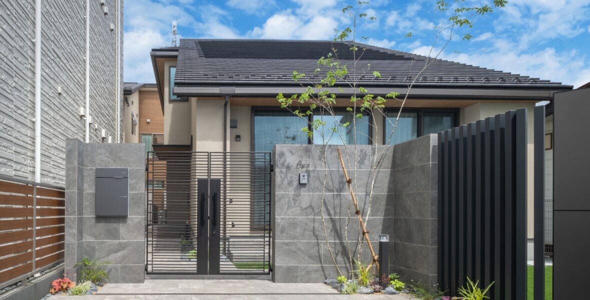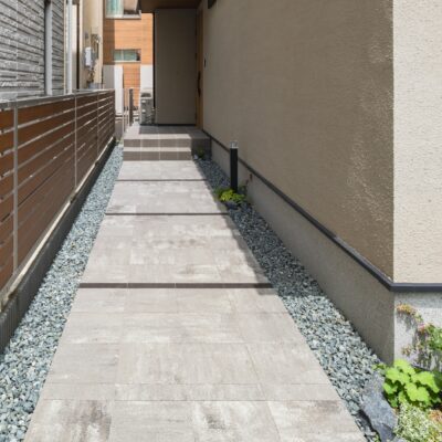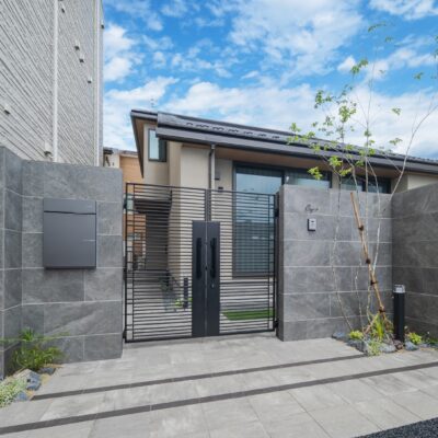 門まわりは、門扉のデザインを際立たせるような、シンプルでモダンなタイルを組み合わせたダイナミックなデザインです。このデザインは20年先を見据えても飽きのこないよう熟考しており、洗練された印象を与えます。