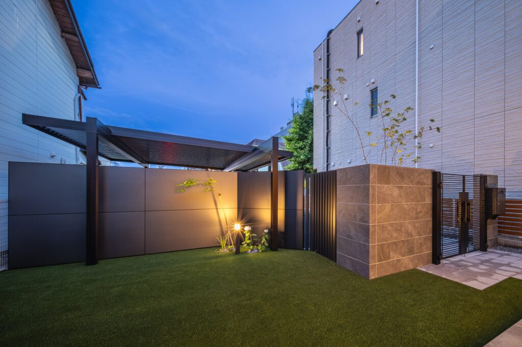 プライベート空間である庭は、外からの視線を遮る高さの塀が設けられており、家族が安心してくつろげるようにしています。また、塀には縦格子を入れたことで、適度な抜け感を演出しつつ、外部からの視線をコントロールしています。