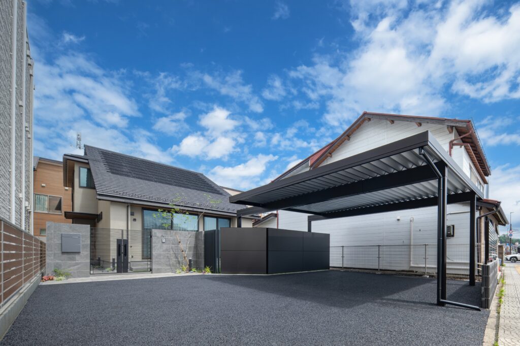 こちらの物件は、交通量の多い道路沿いに位置しているため、敷地内での車の切り返しスペースの確保が課題でした。そこで、車の出入りをスムーズにするため、カーポートの2本の柱を梁延長で広く取り、駐車スペースを最大限に確保しました。これにより、日々の車の出し入れの不安を解消できると思います。