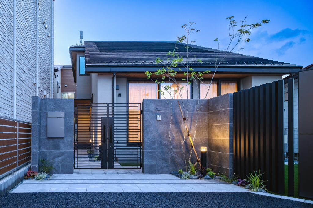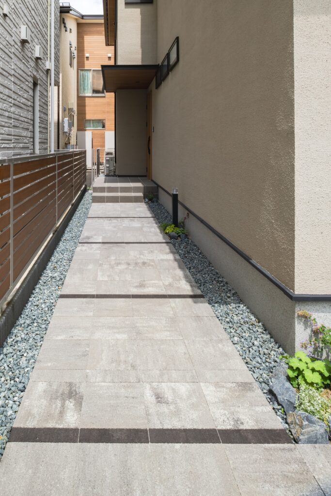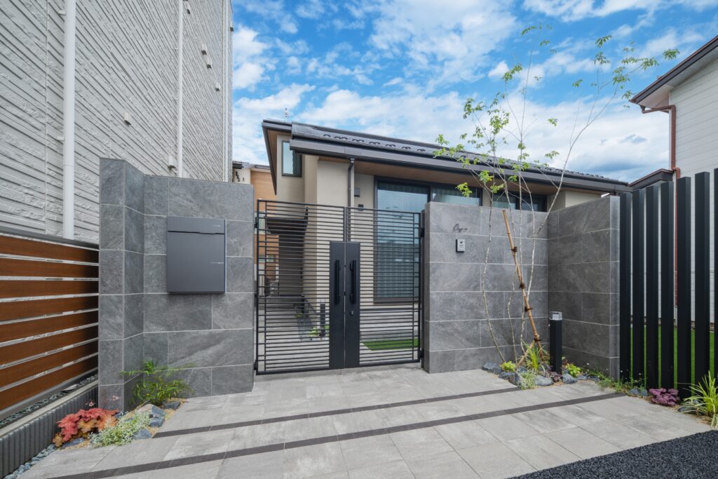 門まわりは、門扉のデザインを際立たせるような、シンプルでモダンなタイルを組み合わせたダイナミックなデザインです。このデザインは20年先を見据えても飽きのこないよう熟考しており、洗練された印象を与えます。
